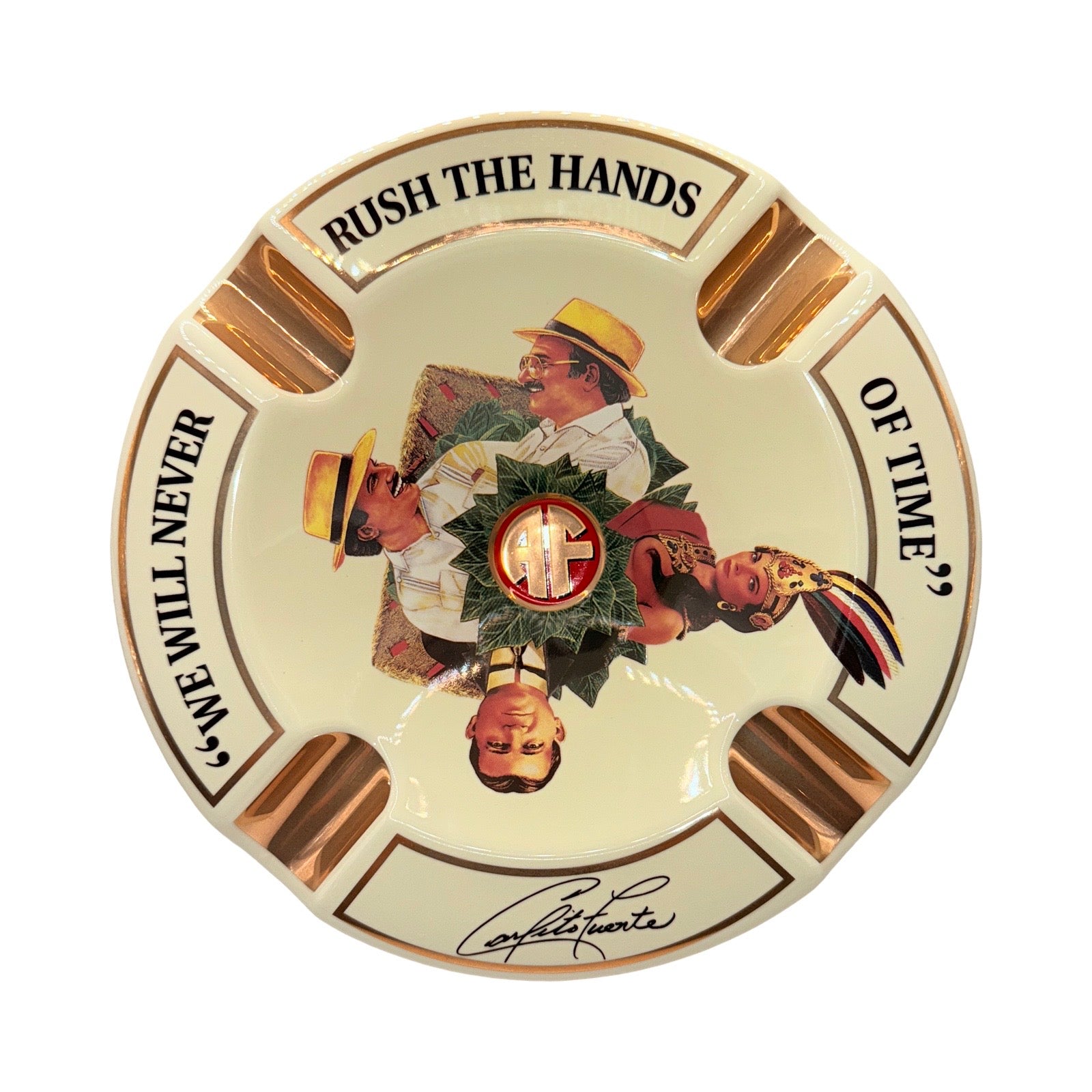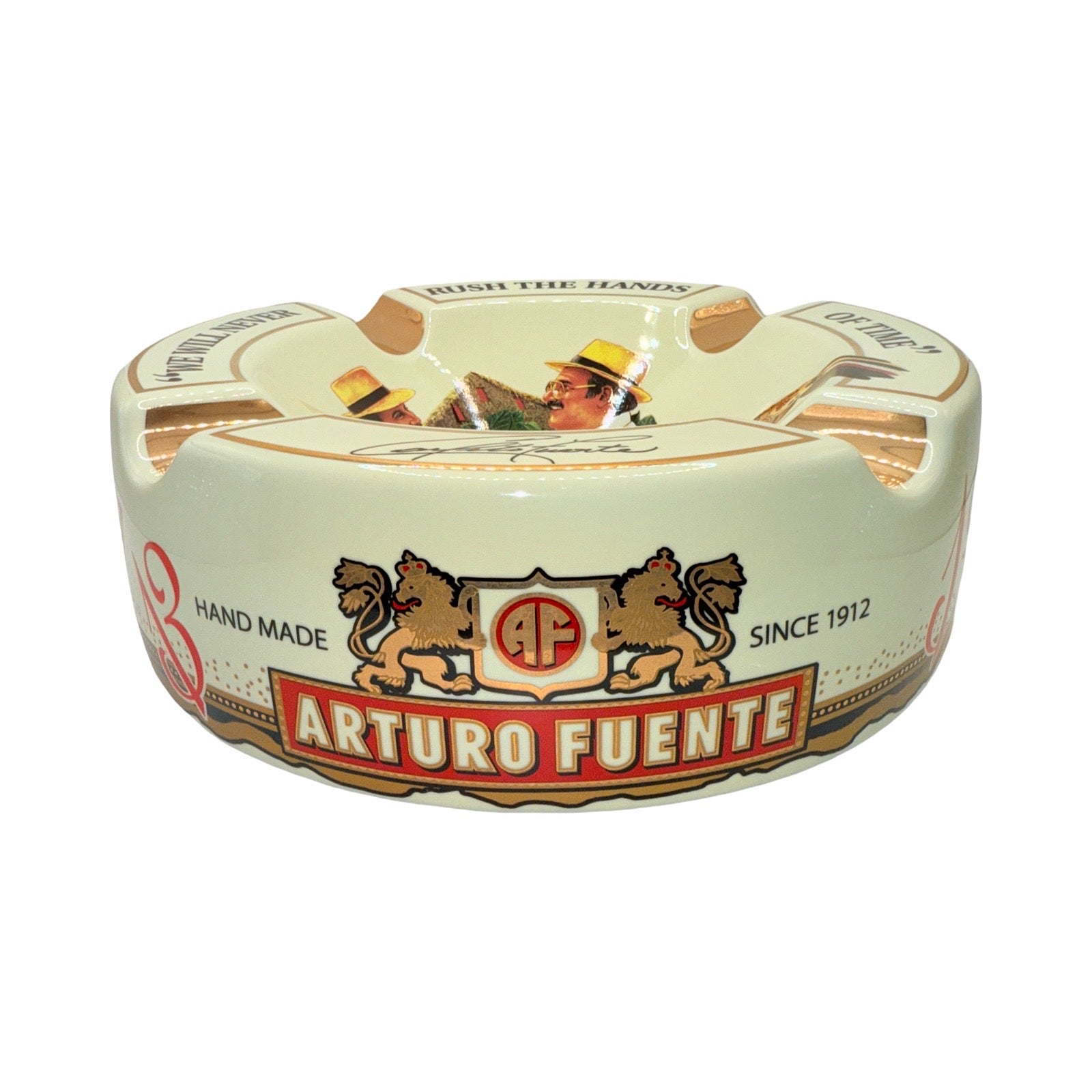 Arturo Fuente offers a variety of ceramic and porcelain cigar ashtrays, featuring iconic branding elements like the "We will never rush the hands of time" motto, the Goddess of Tobacco artwork, and imagery of the Fuente family generations