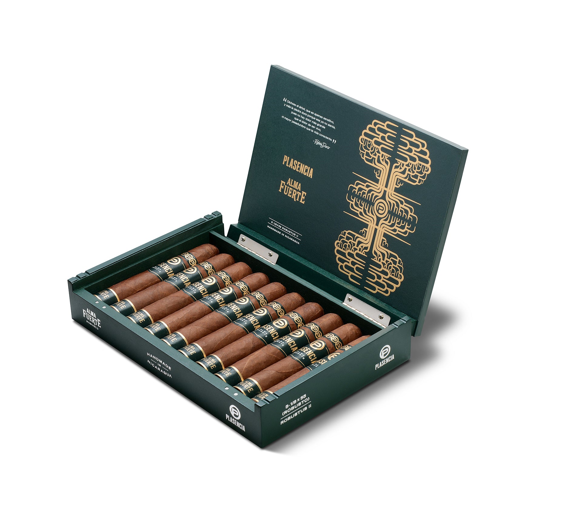 Plasencia Alma Fuerte, a unique blend of our best-aged tobaccos, grown in our highest quality soil, accentuating their bold, vibrant and intense flavors. With hints of dark chocolate, plum, and cinnamon, the taste is rounded out with finishing notes of oak and molasses.